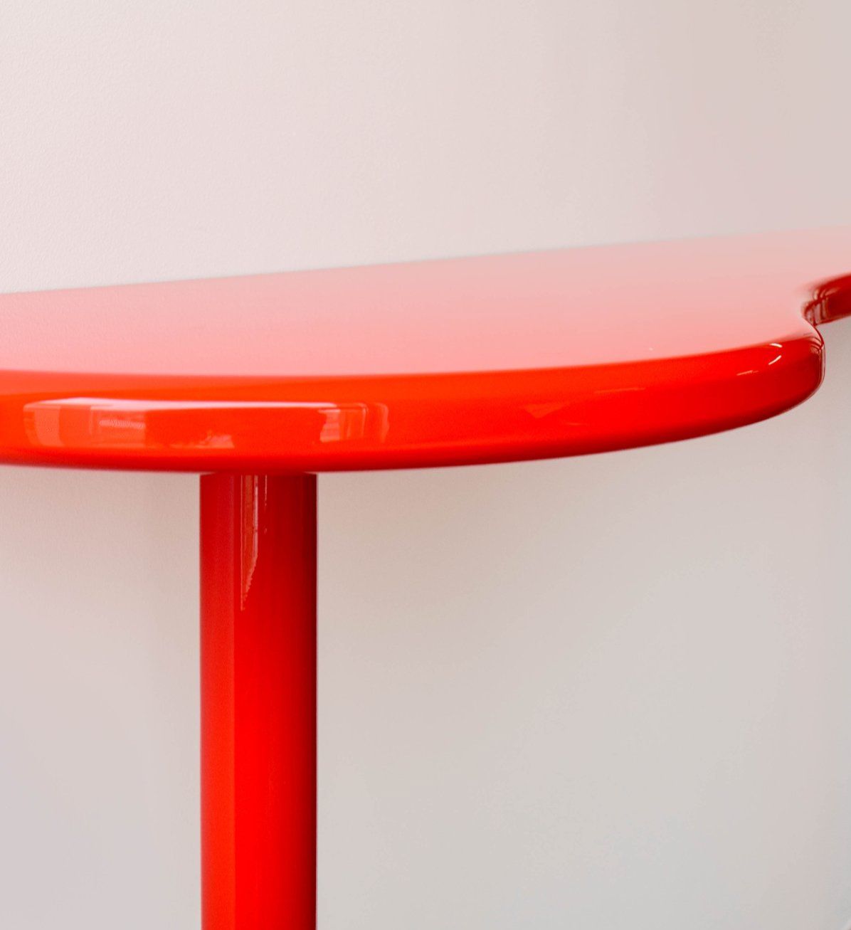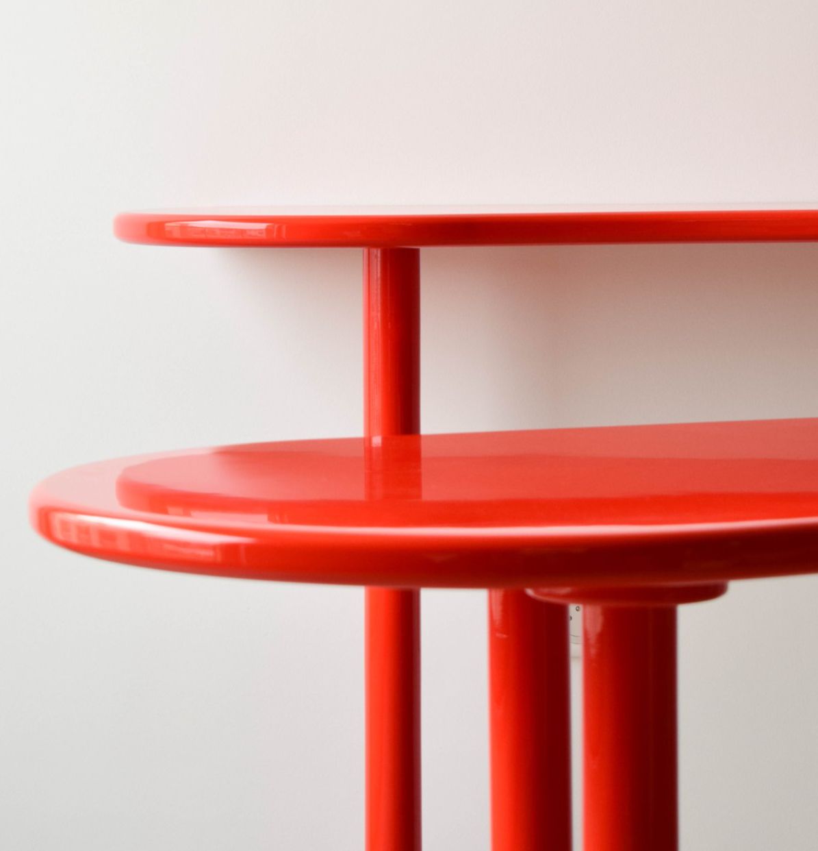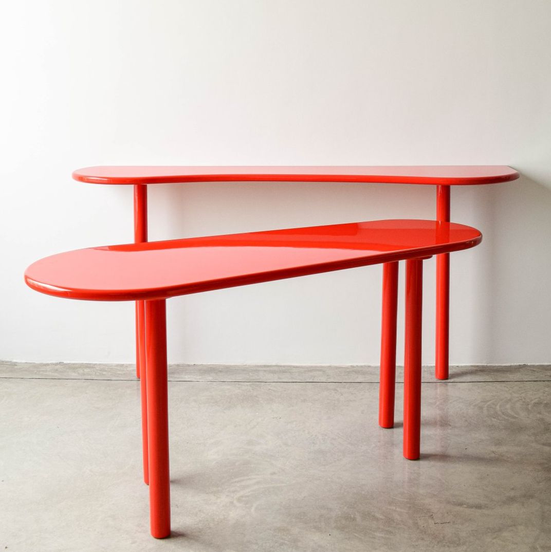 Composition of two flexible-shaped desks arranged in different ways for various uses