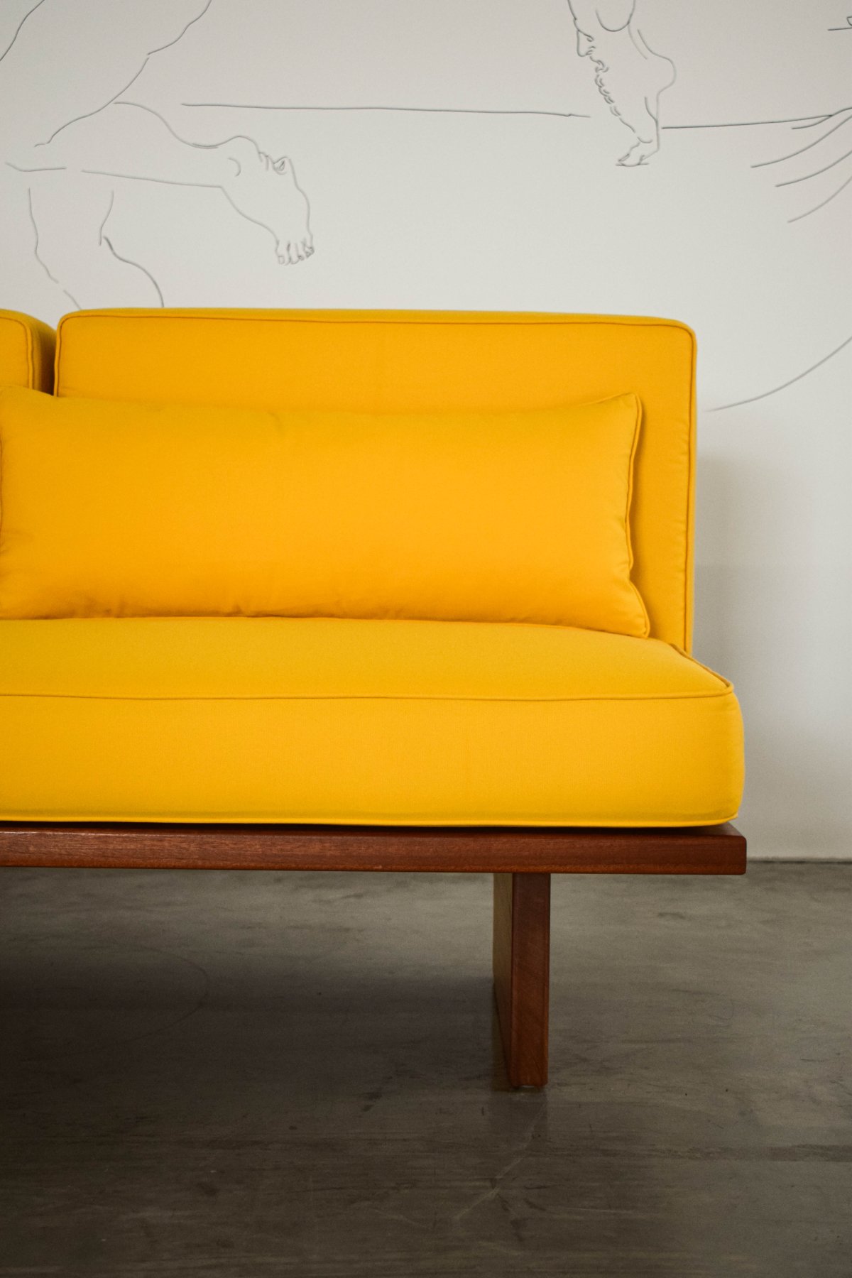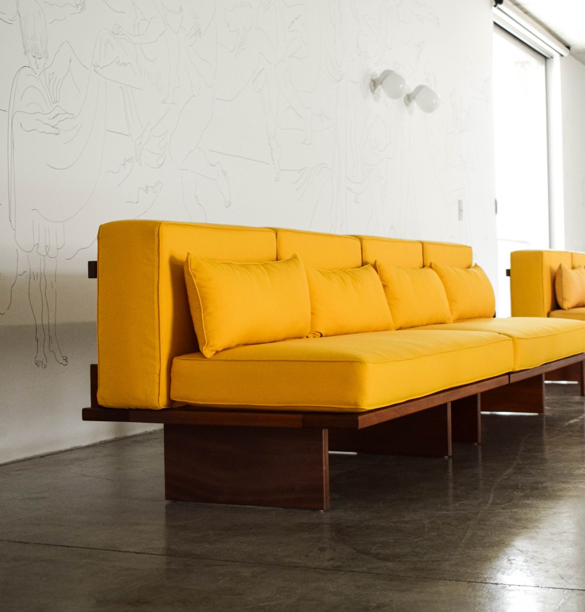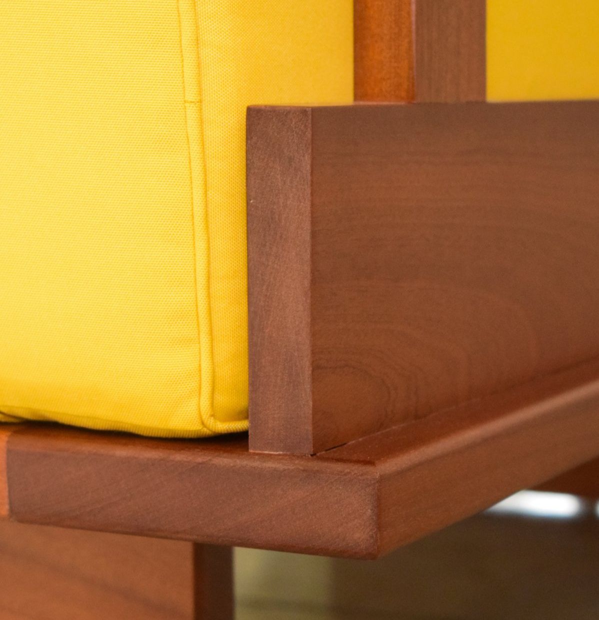 Modular sofa in solid wood with rounded edges carried by two rectangular legs.