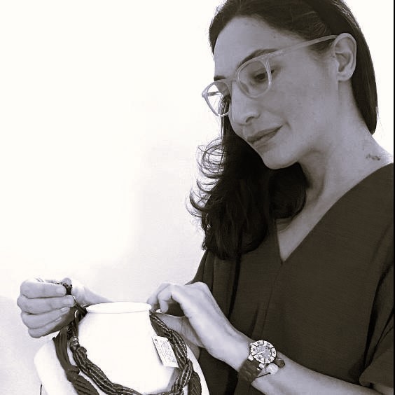 My background is rather atypical. I didn't study fashion or jewellery design. I studied musicology, sociology and anthropology. I've only been designing jewellery and accessories for 3 years, after more than fifteen years as a teacher. I use a technique that I learnt on the job... To imagine a piece, I never start with a drawing, but rather with a knot that I make and undo, or a combination of colours that I want to try out. The most important thing for me is the choice of colours... always an unlikely combination.