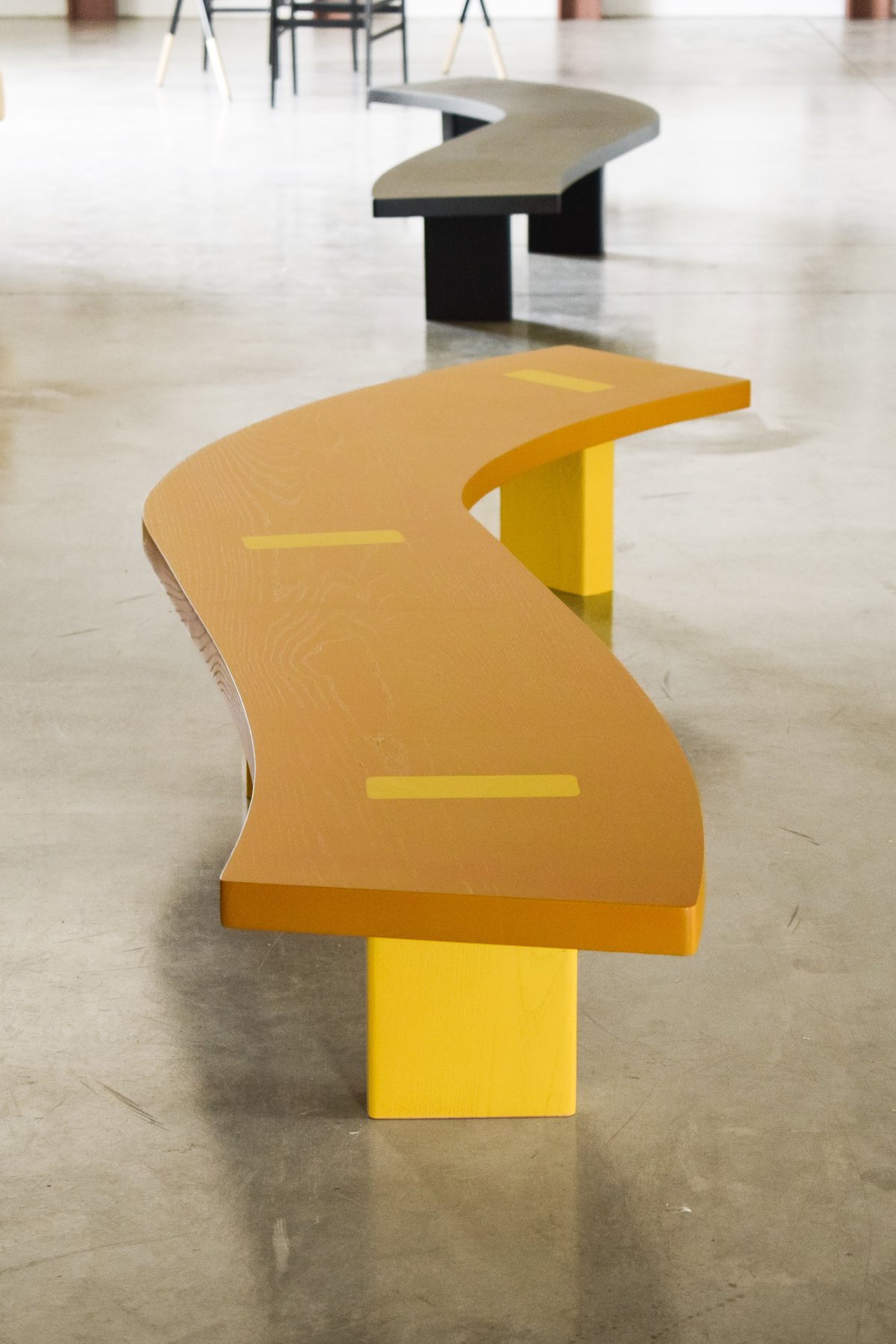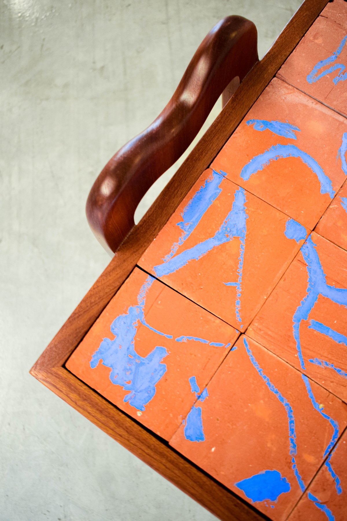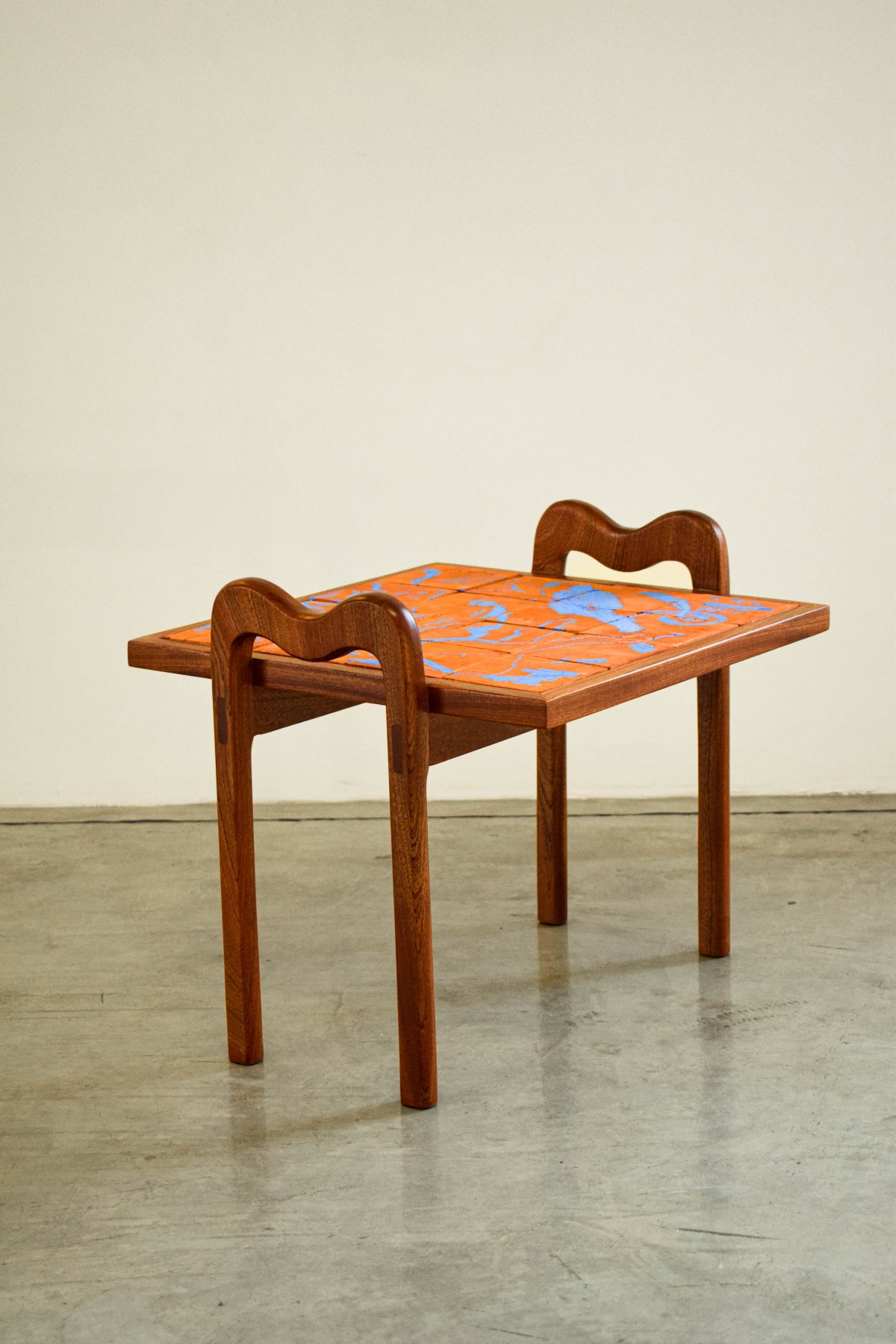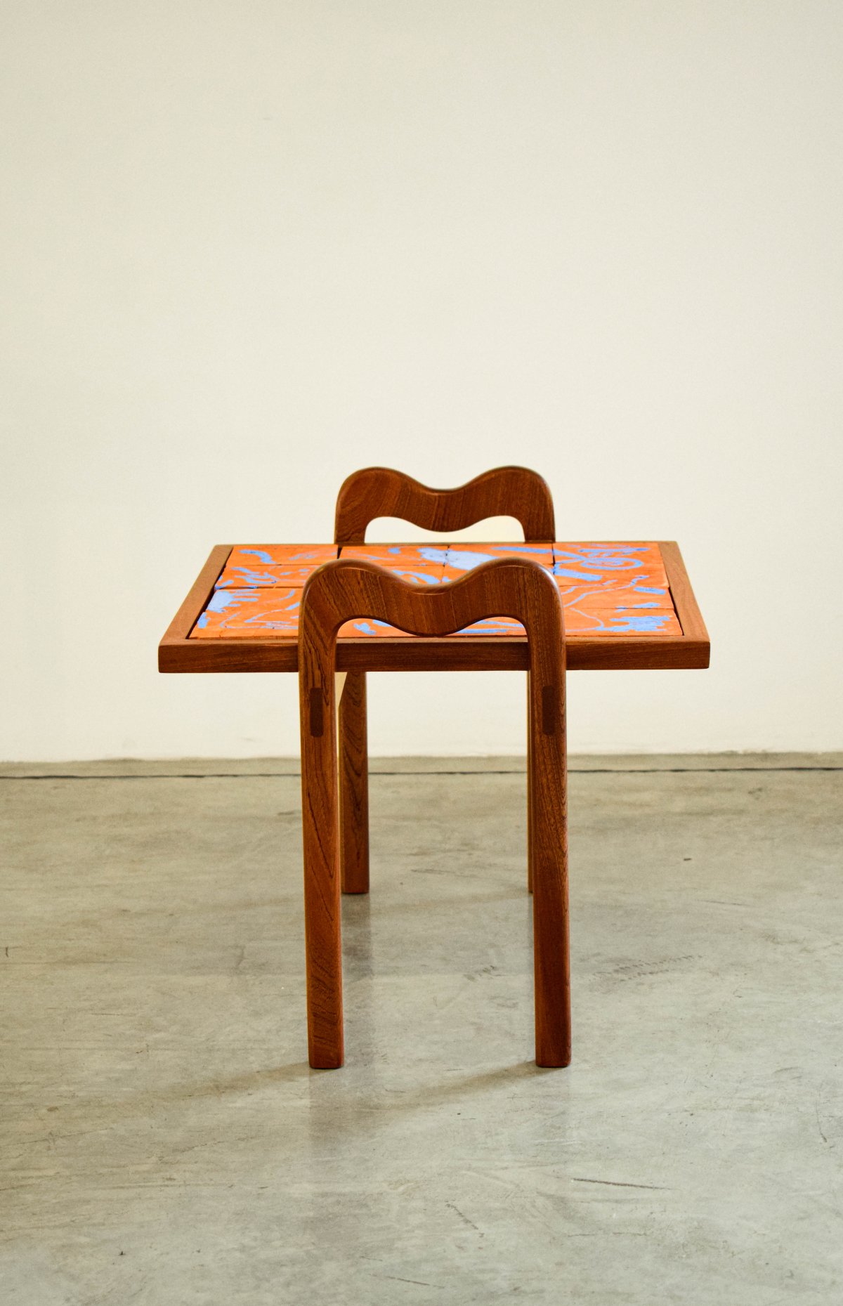 A thin, easy-to-move coffee table featuring ceramic drawings crafted by Aymen Mbarki.
