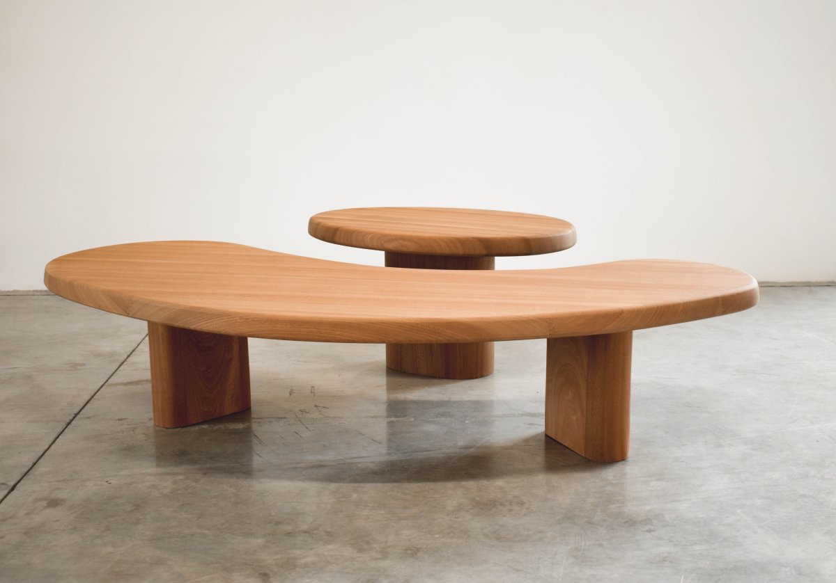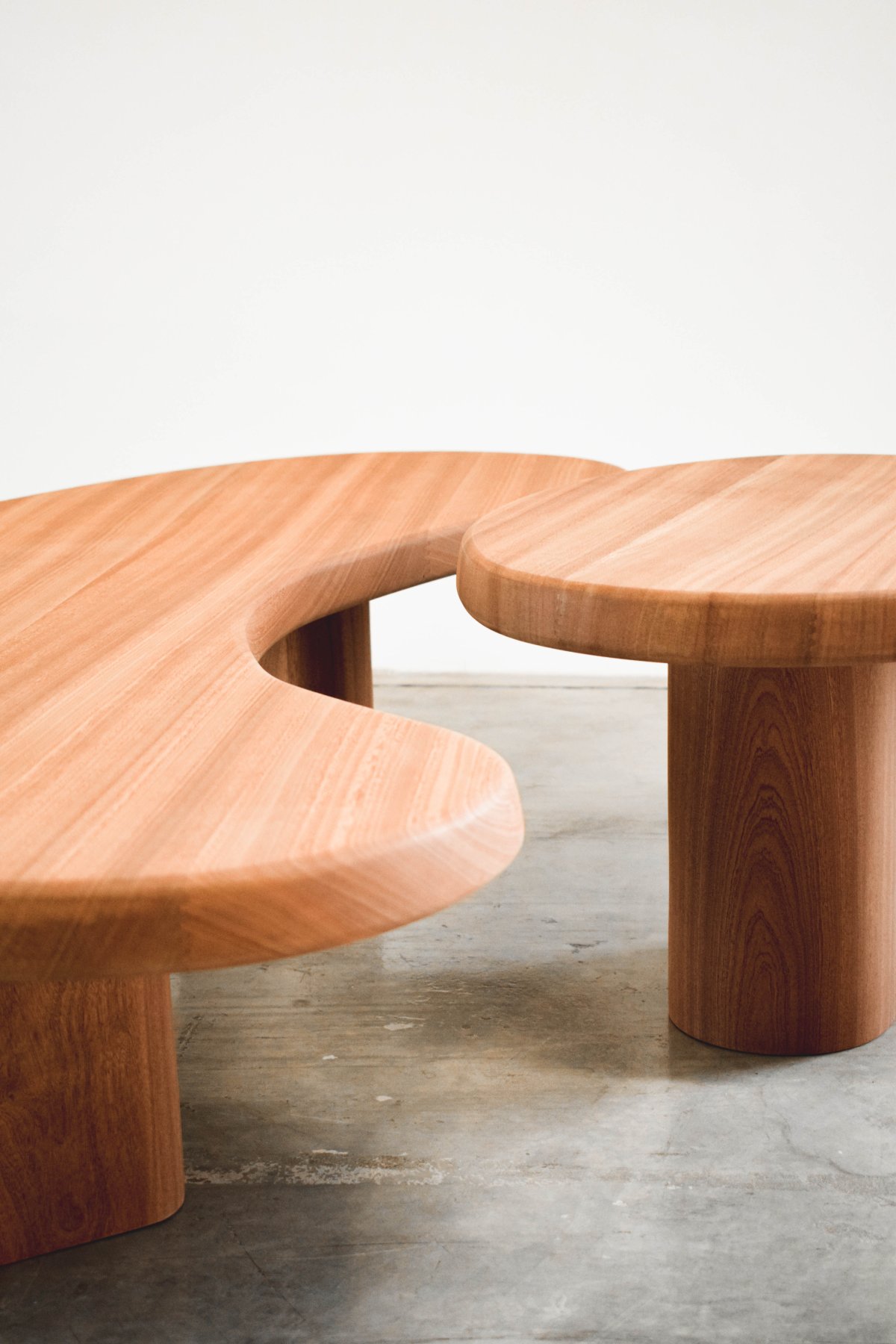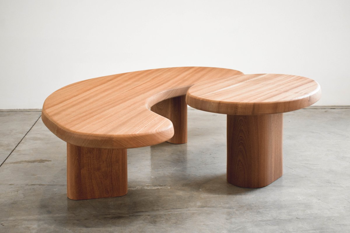 A bean shaped two sizes coffee tables resting on rectangular legs with round edges.