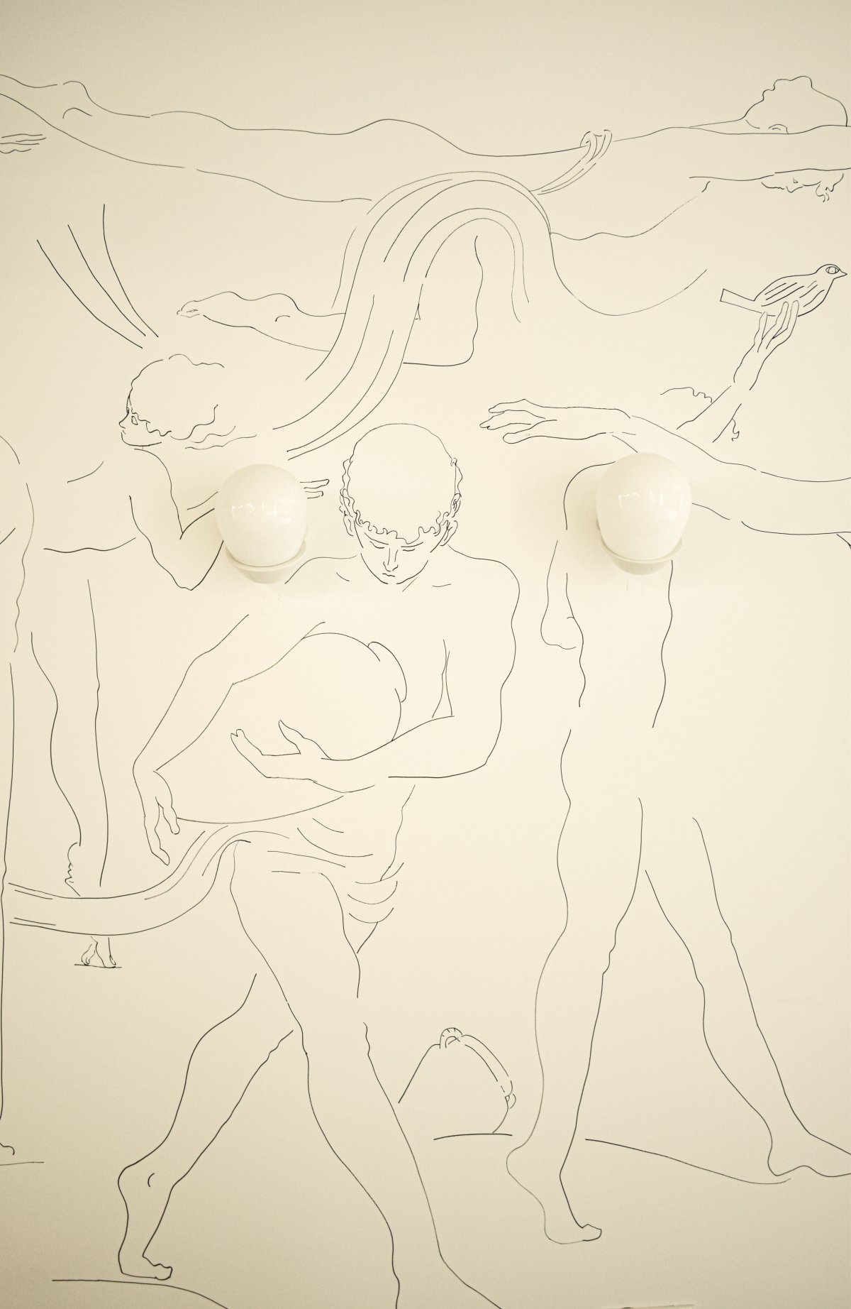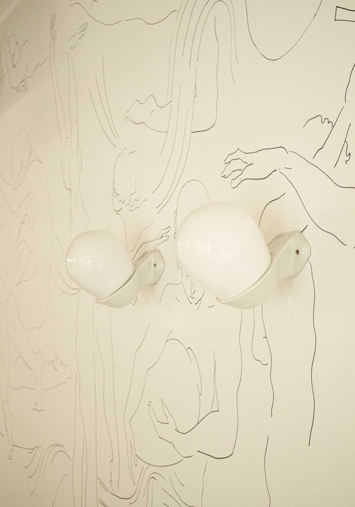 A magnificent and progressive design for the 1950s, this wall light is made of proclain and opal glass.