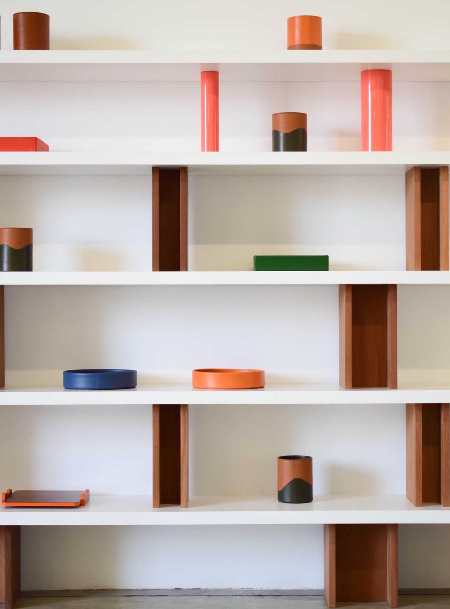 Bookcase punctuated by shelves resting on framed cylindrical and U-shaped solid wood supports. Crafted from mahogany and lacquered wood, the interplay of materials and forms brings both warmth and balance to the design. A statement piece that organizes space while introducing a strong visual identity.