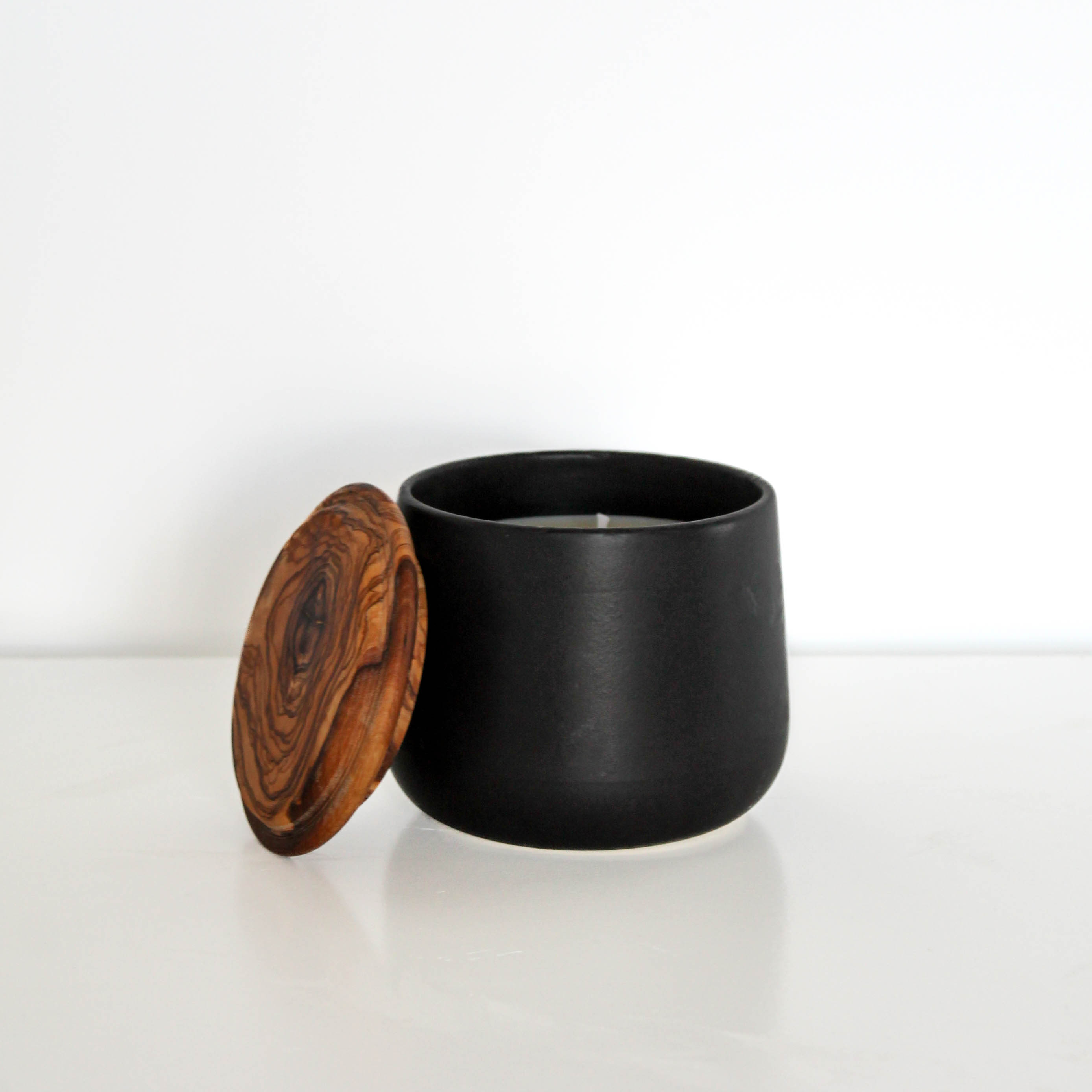 A scented candle presented in a rounded matte vessel, complemented by a lid crafted from olive tree wood. Made from high-quality natural beeswax, it is designed to offer an immersive sensory experience, where delicate blooming florals evoke the freshness of Jardin Précieux. It brings a touch of nature's grace into any space.