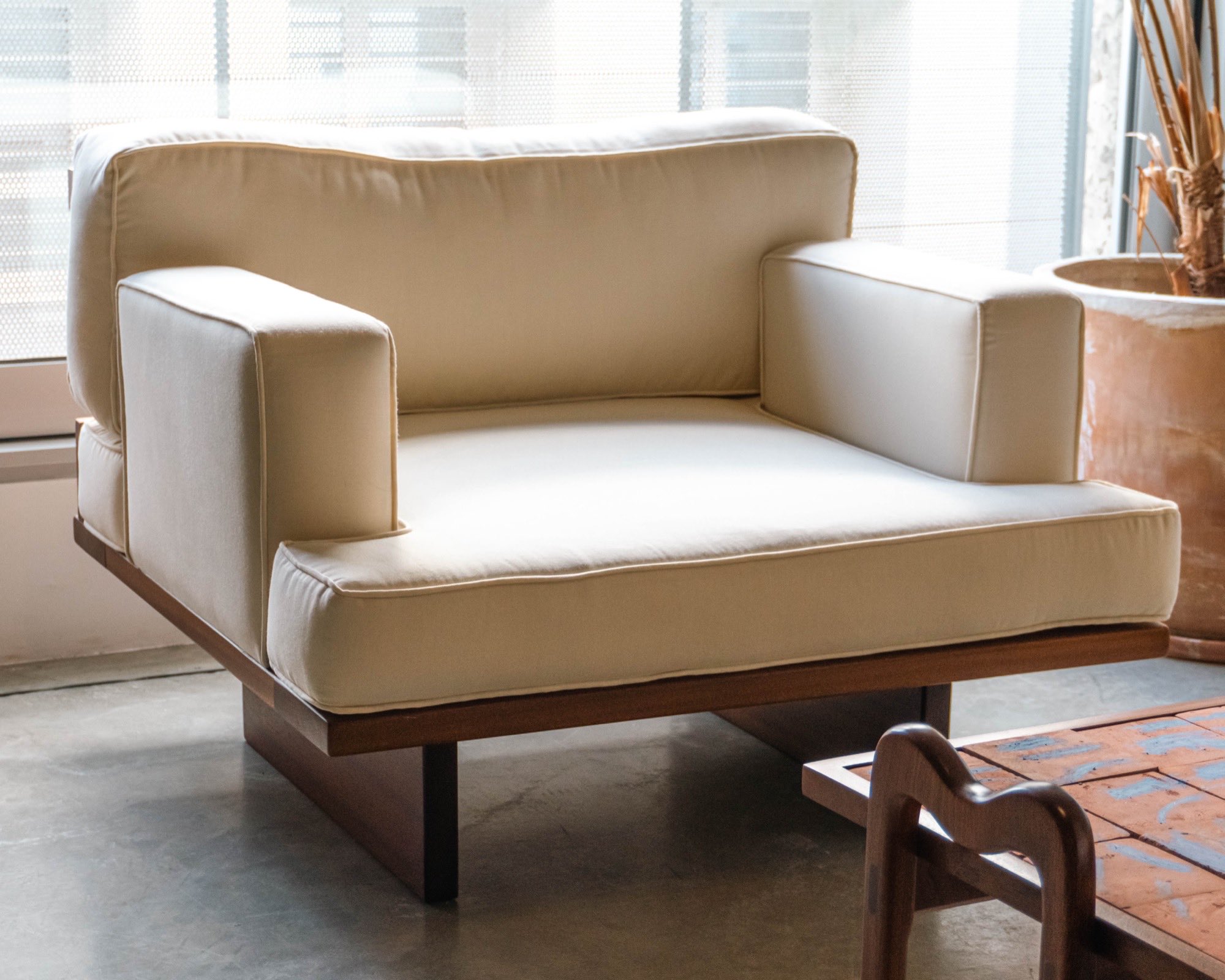 Armchair in solid wood with rounded edges carried by two rectangular legs. Generous upholstery offers a deeply comfortable seating experience, while the contrast between the warmth of the wooden frame and the softness of the neutral fabric creates a balanced and inviting piece. Defined by its clean lines and grounded proportions, the armchair brings both comfort and visual harmony to a space. Customizable upon request.