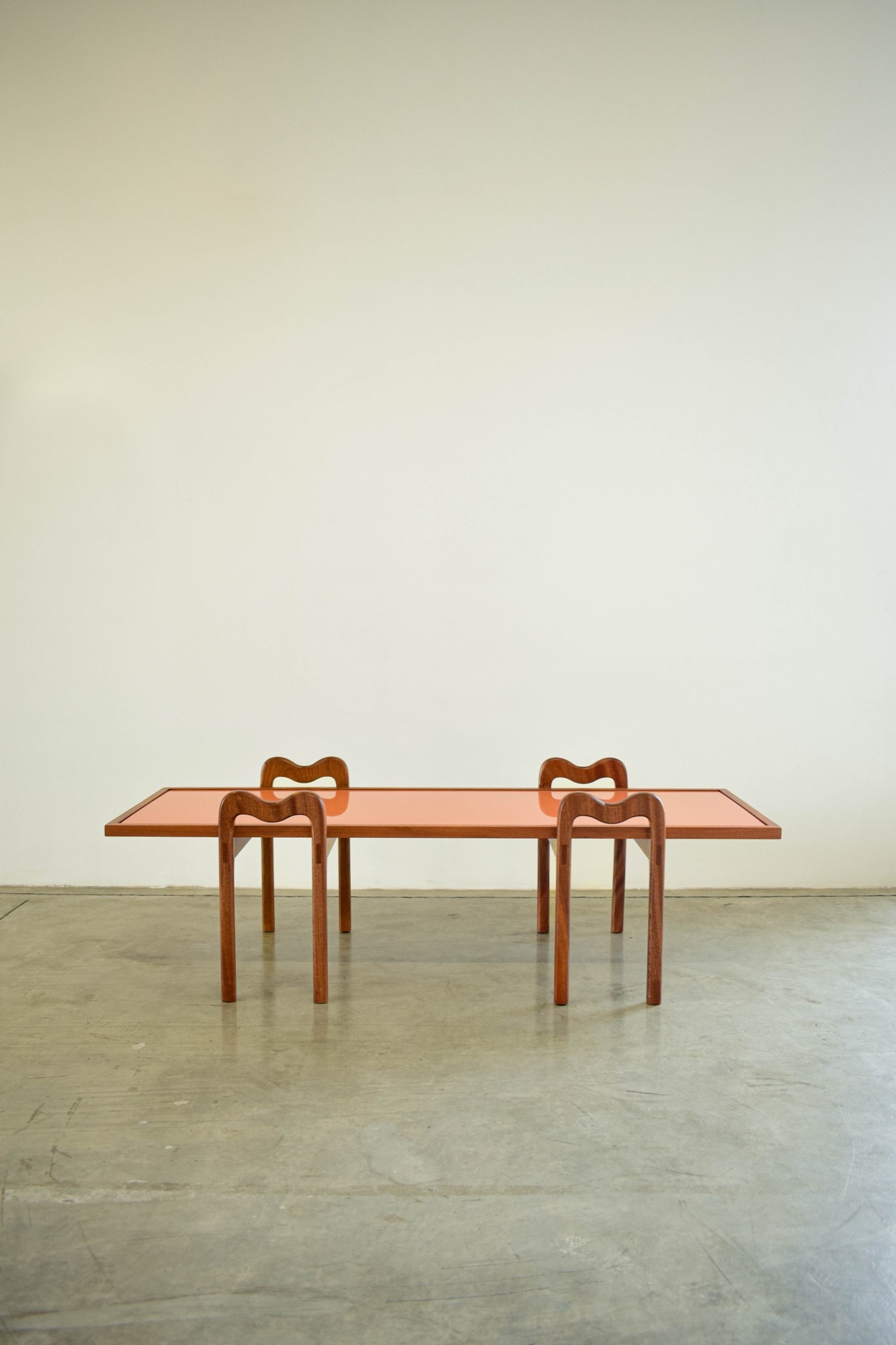 Thin and easy to move coffee table with a glossy top. Its minimalist silhouette is elevated by a glossy lacquered top, creating a delicate contrast with the warmth of the rich mahogany structure. Together, the materials form a balanced design, perfectly suited to refined interiors.