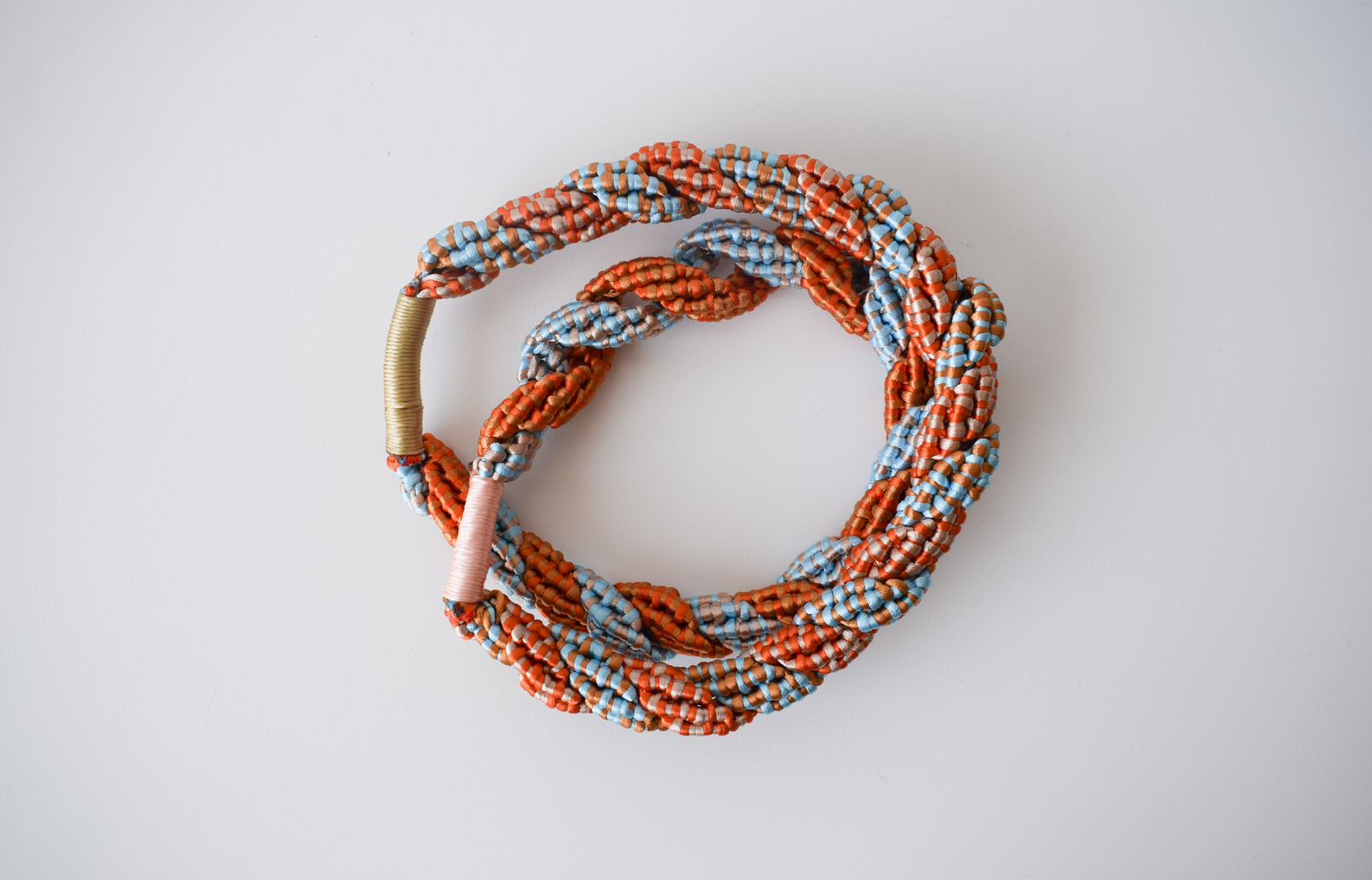 Hand-woven silk satin accessory from the JELLYFISH series. Each piece is meticulously crafted by hand — never from a drawing, but from a knot made and unmade, from a color combination waiting to be explored. Conceived to be worn alone or layered, allowing each person to express their own unique style.